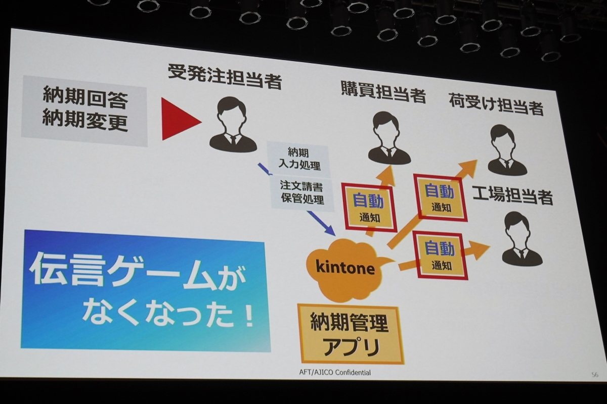 例えば、「納期管理業務」では、納期調整のたびに発生する、メールや電話による伝言ゲームと手作業での入力処理に頭を悩まされていた。そこで、「納期管理」アプリを作成し、まずは、kintoneの自動通知機能で伝言ゲームを解消した。