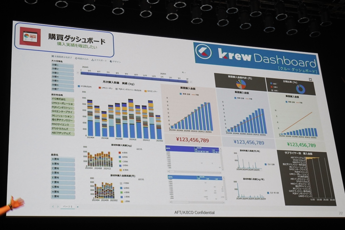 kintoneの標準機能だけでなく、プラグインや連携サービスの活用も進んでいる。特に利用されているのが、「krewDashboard」(メシウス)による購買ダッシュボードアプリだ。予実管理をダッシュボード化し、スライサー機能によって情報検索のスピードを向上させている。「krewSheet」(メシウス)も導入しており、Excelライクな操作によって、kintoneの利用範囲が広がるきっかけになったという。