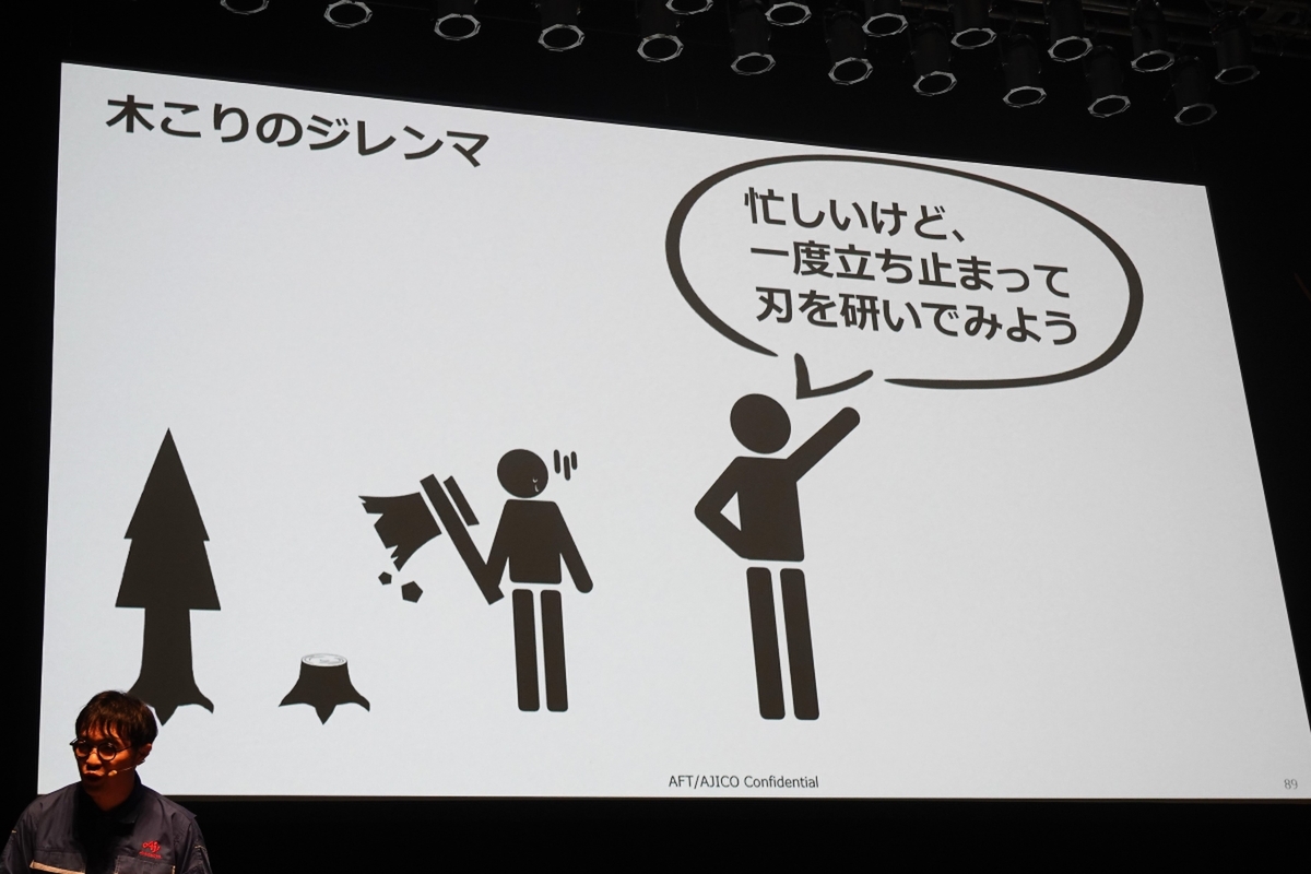 大野氏は、業務改善のあり方を「きこりのジレンマ」に例える。目先の仕事に追われ、斧を研ぐことができないきこりの話だ。膨大な業務をこなさなければならない時こそ、一度立ち止まってしっかりと斧を研ぐ、つまり業務改善を行うことが重要になる。kintoneは気づいたことをその場で簡単に修正できるため、斧を研ぐための強力なツールとなる。