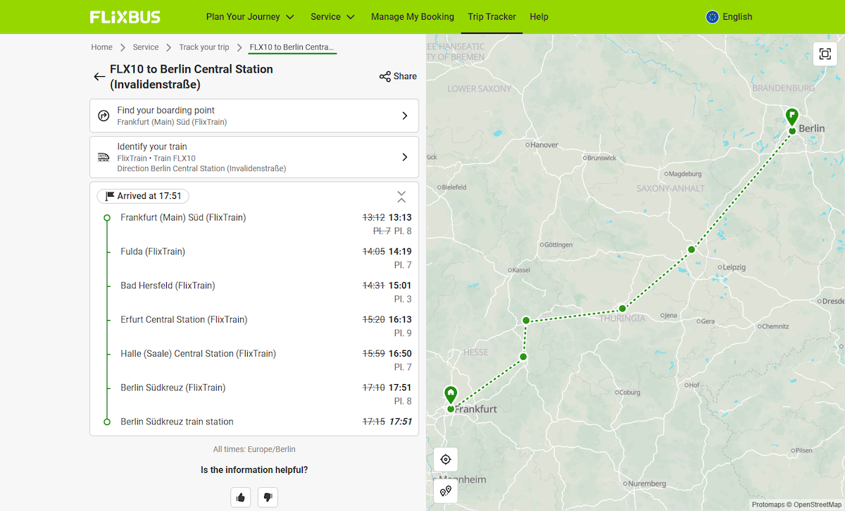 そんなこんなで、フランクフルト南駅を1分遅れで出発し、途中5駅に停車して目的地の終点ベルリン=ズュートクロイツ駅に到着したのは36分遅れの17時51分。4時間40分ほどの乗車でした。