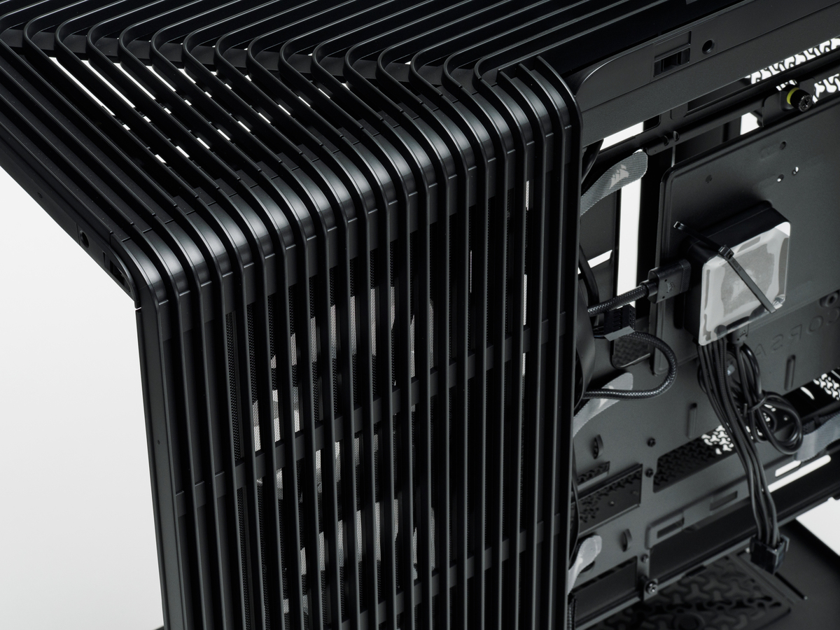 また、この天面から右側面にかけては、まるで水が流れ、滝となって落ちていくかのようなラインが施されている。特に内部が見えるケースでは無個性になりがちな右側面だが、細部までしっかりとデザインが考えられている。