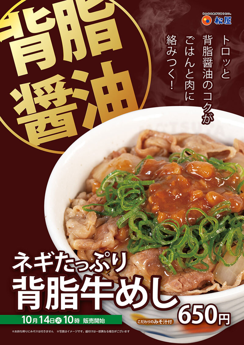 牛めしの「松屋」は、42店舗限定で「ネギたっぷり背脂牛めし」を本日10月14日に販売開始しました。