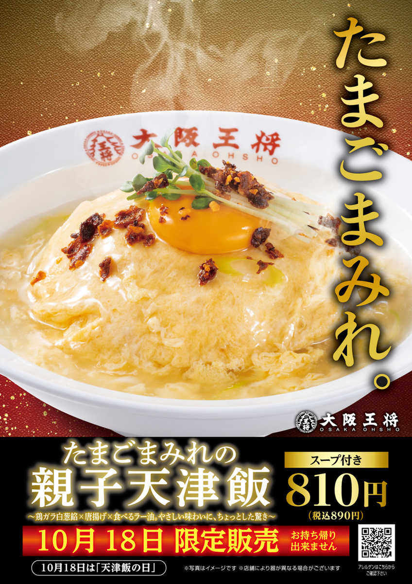 大阪王将は10月18日、「天津飯の日」を記念して、1日限定メニュー「たまごまみれの親子天津飯」を発売します。全国の大阪王将(一部店舗を除く)で提供されます。