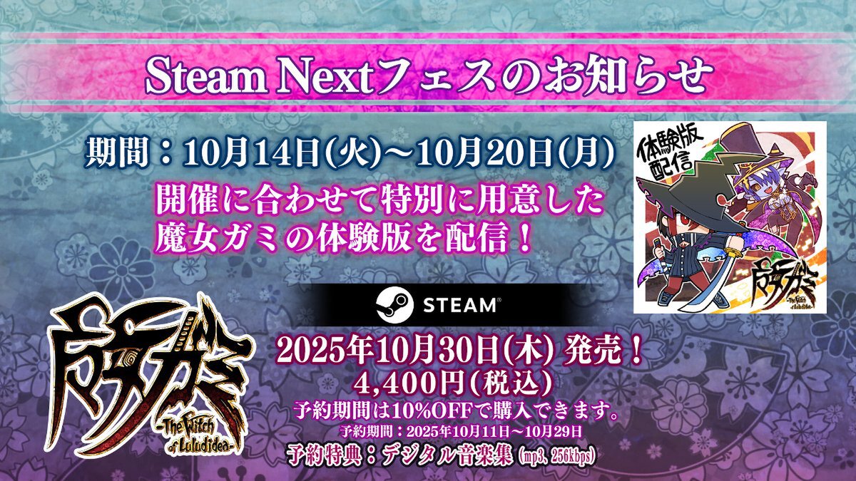 インティ・クリエイツは10月14日、Nintendo Switch 2/Nintendo Switch/PC(Steam)向け2D横スクロールアクションゲーム『魔女ガミ-The Witch of Luludidea-』について、現在開催中の「Steam Nextフェス」でPC(Steam)版の体験版を配信すると発表。「Steam Nextフェス」の開催期間は、2025年10月20日午前2時まで。