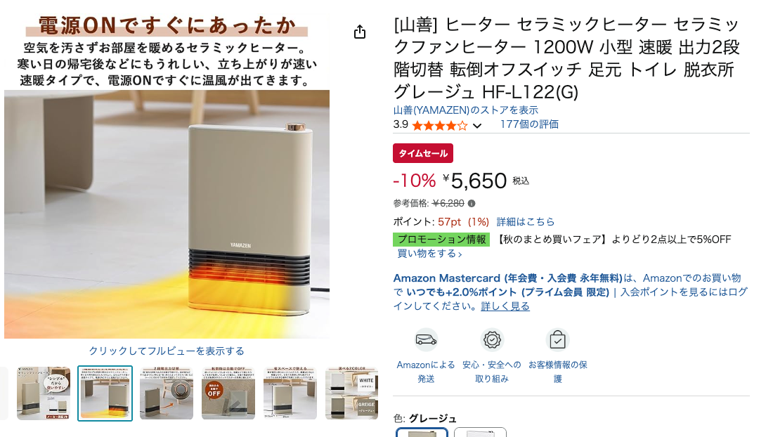 Amazonタイムセールで、山善(YAMAZEN)の速暖セラミックファンヒーター「HF-L122(G)」が登場!