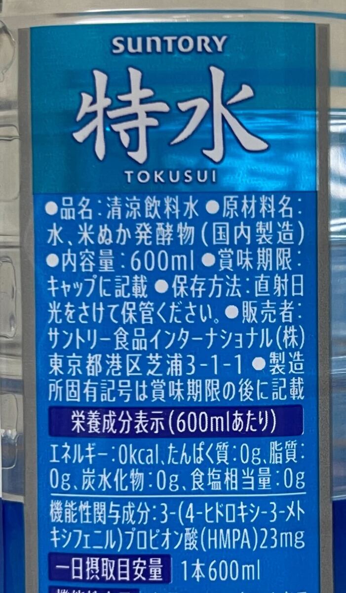「特水」は、米ぬか発酵物由来のポリフェノール「HMPA」を配合した機能性表示食品です。「HMPA」には、“BMIが高めの方の内臓脂肪を減らすのを助ける機能“が報告されています。内容量は1本600mlで、価格は162円です。