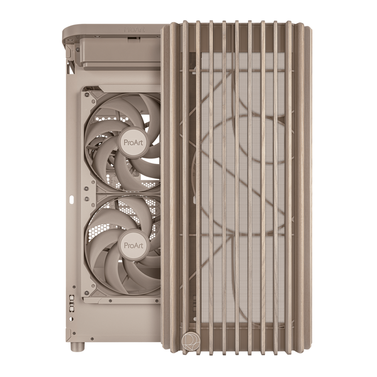 「ProArt PA401 Wood Edition Beige」は、持続可能な素材を採用した木製フロントパネルが特徴。使用されている木材は森林管理協議会(FSC)認証を受けており、美しさと環境への配慮を両立している。さらに、デュアル160mmファンと33%の開口率を誇るフロントグリルにより、長時間の作業でも高い冷却性能を維持する。