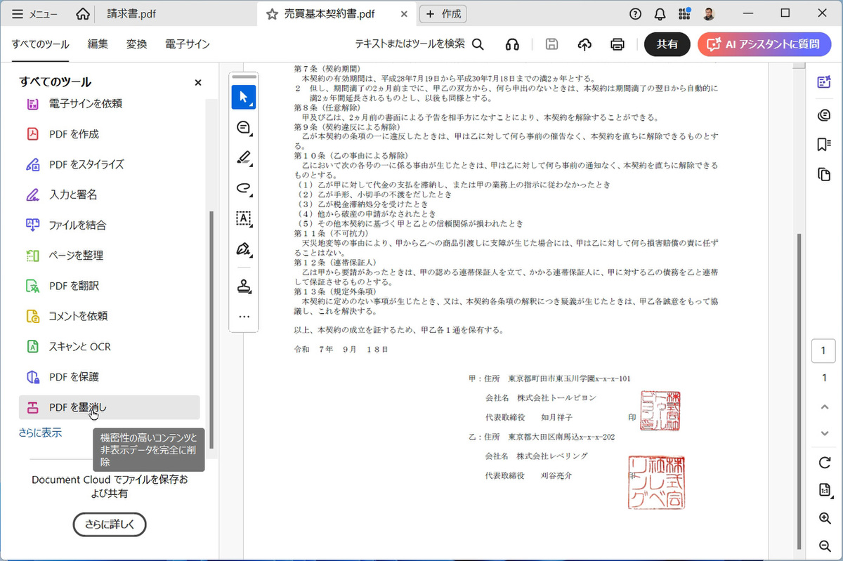 そんな時に活躍するのが、Acrobatの「墨消し」機能だ。「墨消し」は、テキストや画像をPDFから完全に、復元不可能な形で削除できるのが特徴。見た目を黒く塗りつぶすだけでなく、その部分に存在していたデータそのものを文書から取り除けるのだ。