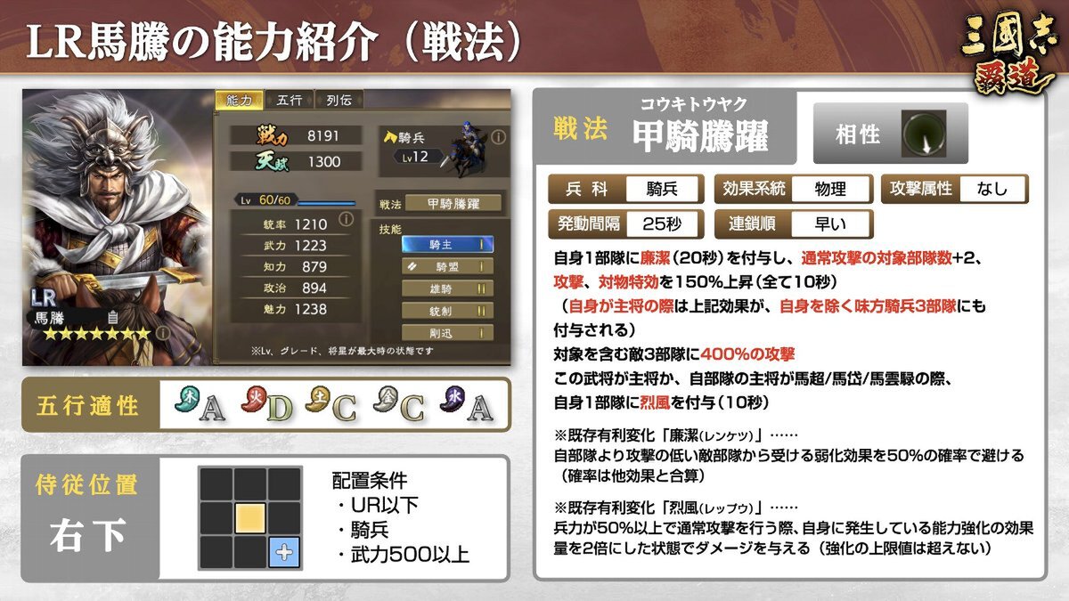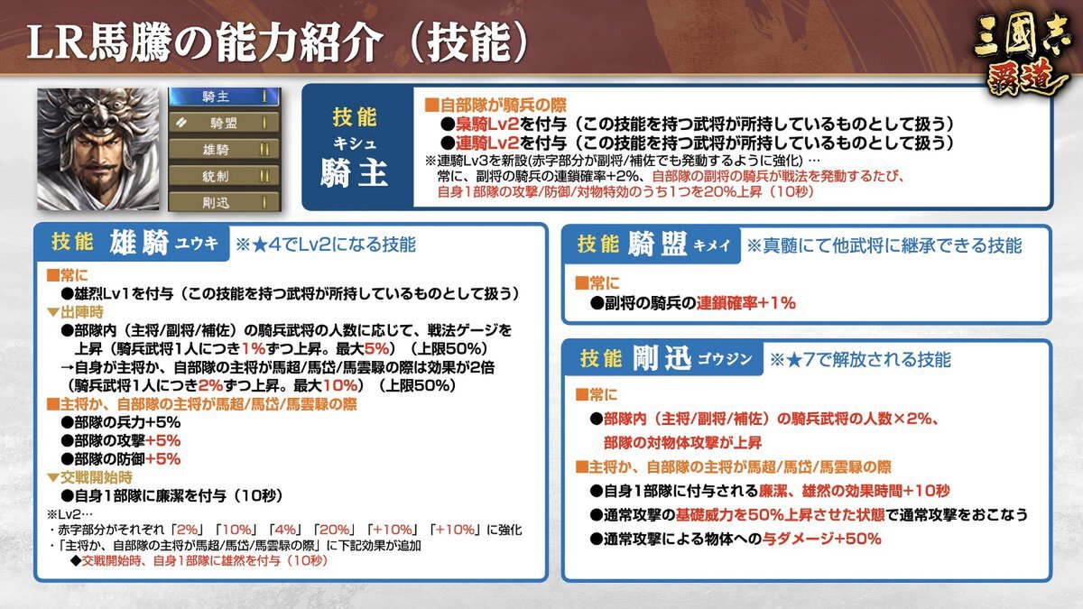 LR「馬騰」は、通常攻撃を強化する効果を複数持ち、自身が主将の際は、戦法で自身含む味方騎兵4部隊に「廉潔」などのさまざまな強化効果を付与することが可能。「自身が主将か、主将が馬超/馬岱/馬雲騄」の際には、出陣時の戦法ゲージを大きく上昇させる技能効果を発揮でき、馬超らと非常に相性の良い騎兵武将だ。