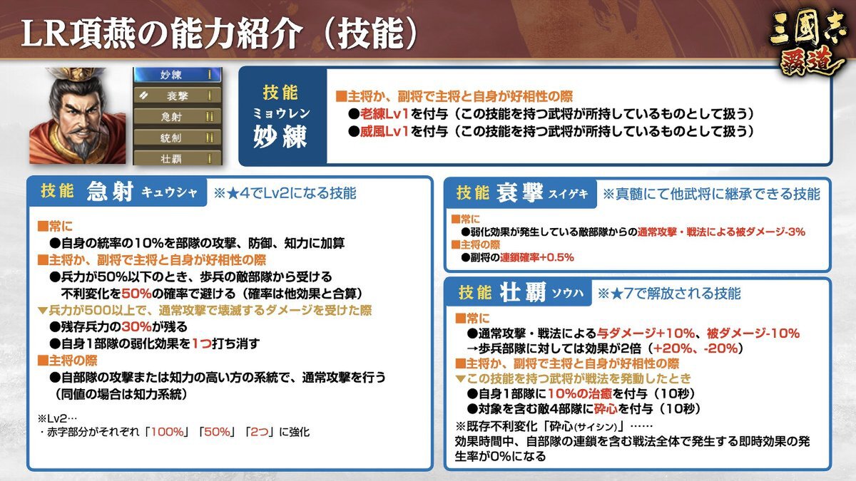 LR「項燕」は、耐久力と弱化効果への耐性を持ち長期戦に優れ、通常攻撃で壊滅するダメージを受ける際に、兵力を大きく残して耐えつつ弱化効果を打ち消せる。さらに兵力が50%以下のとき、歩兵の敵部隊から受ける不利変化を避ける技能を持つため、最後まで粘り強く戦い続けることができる弓兵武将となる。