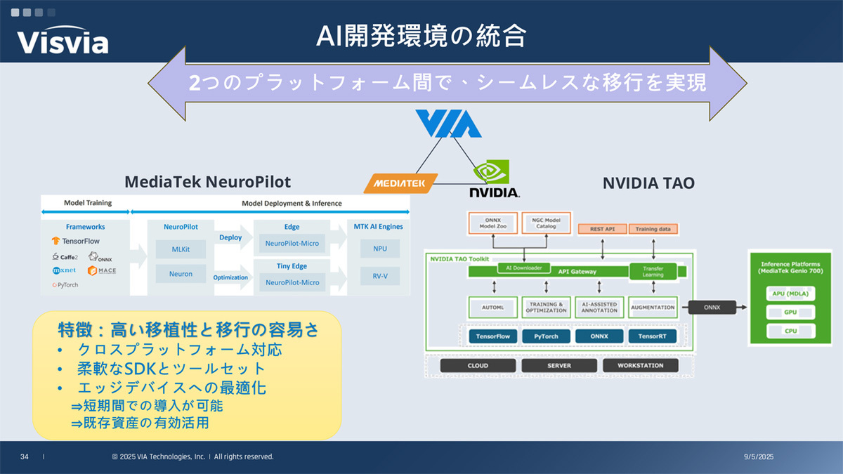 また、開発ツールとして、Pythonから直接AIアクセラレータ(MDLA)を制御できる独自ツール「VIA Neuron Runtime Helper」も開発済みで、AIアプリケーションの高速開発を実現している。これは他社にはない圧倒的な利便性として評価されている。