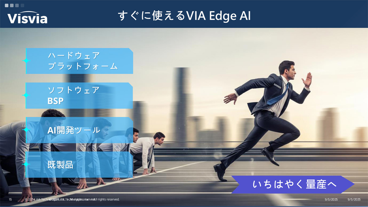 そのため、VIA Technologies Japanのビジネス領域は、従来のIoT機器販売からAIエッジデバイスを軸としたソリューション提案型モデルへと進化している。クラウドとローカルAIの分散処理が求められる時代に対応し、ハードウェア提供にとどまらず、通信・API・AIモデルの統合設計を視野に入れた取り組みを進めている。