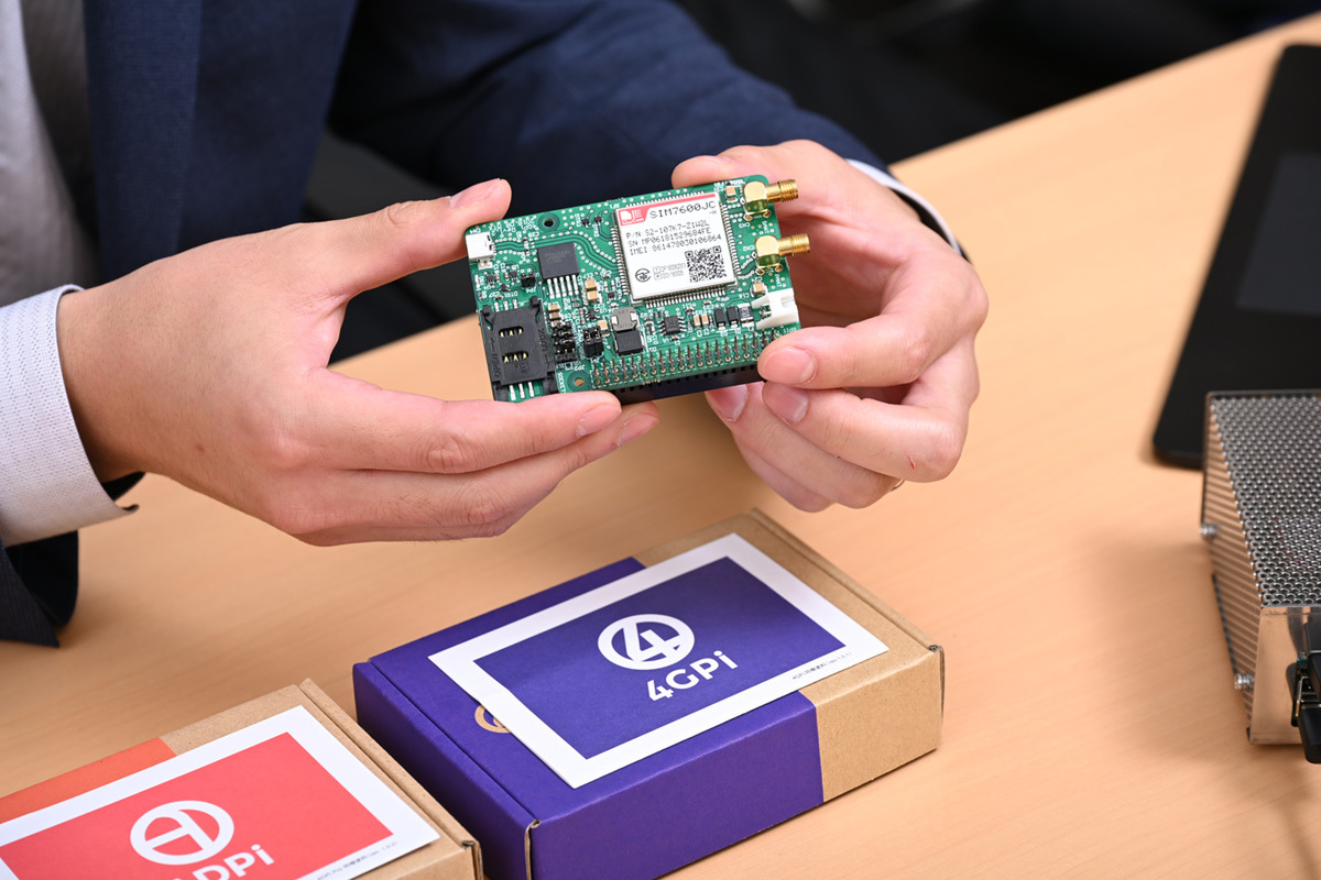 第1の製品系統は、携帯通信モジュールを搭載した「4GPi」シリーズだ。4G(LTE)通信モジュールを採用し、ラズパイにスタックして使用できる構造となっている。ユーティリティソフトや接続コマンドはGitHubで公開されており、導入ハードルの低さを重視した設計となっている。同製品は2014年発売の「3GPi」から改良を重ねており、国内のIoT実証実験や遠隔監視システム等での豊富な採用実績を持つ。