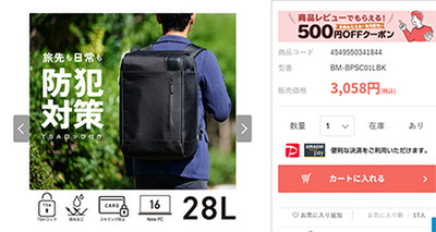セール商品の一例を挙げると、防犯バックパック28L「BM-BPSC01LBK」が驚きの3,058円で販売中。