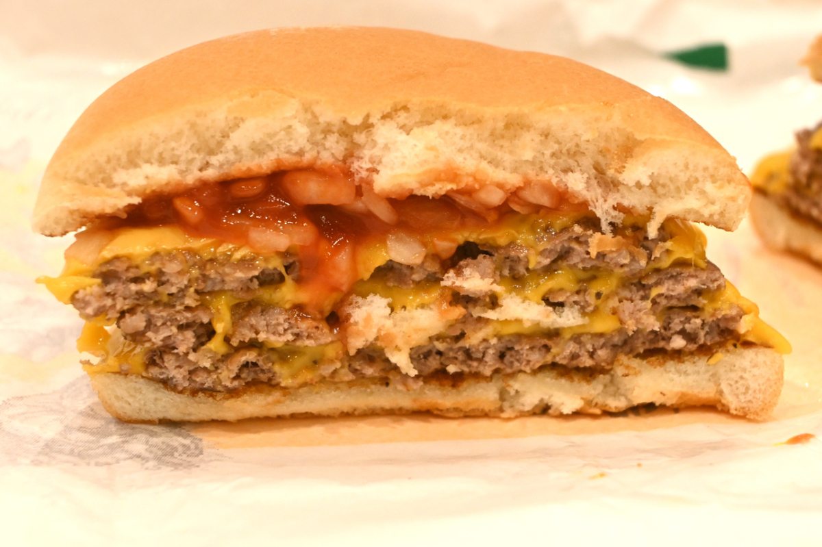 そして「トリチ」。ジューシーな100%ビーフパティを豪快に3枚重ね、その間にコクのあるチェダーチーズを3枚サンドした、「ダブチ」のトリプル版です。