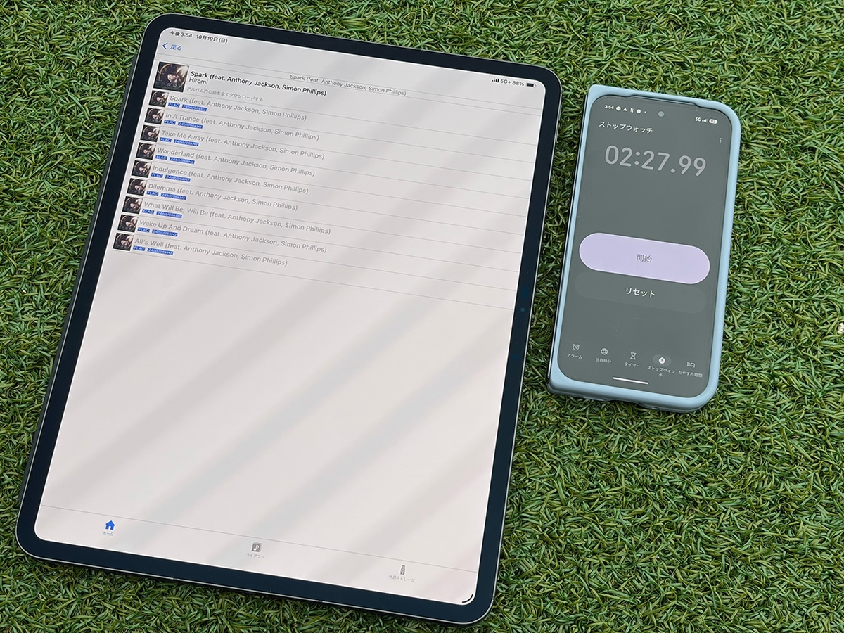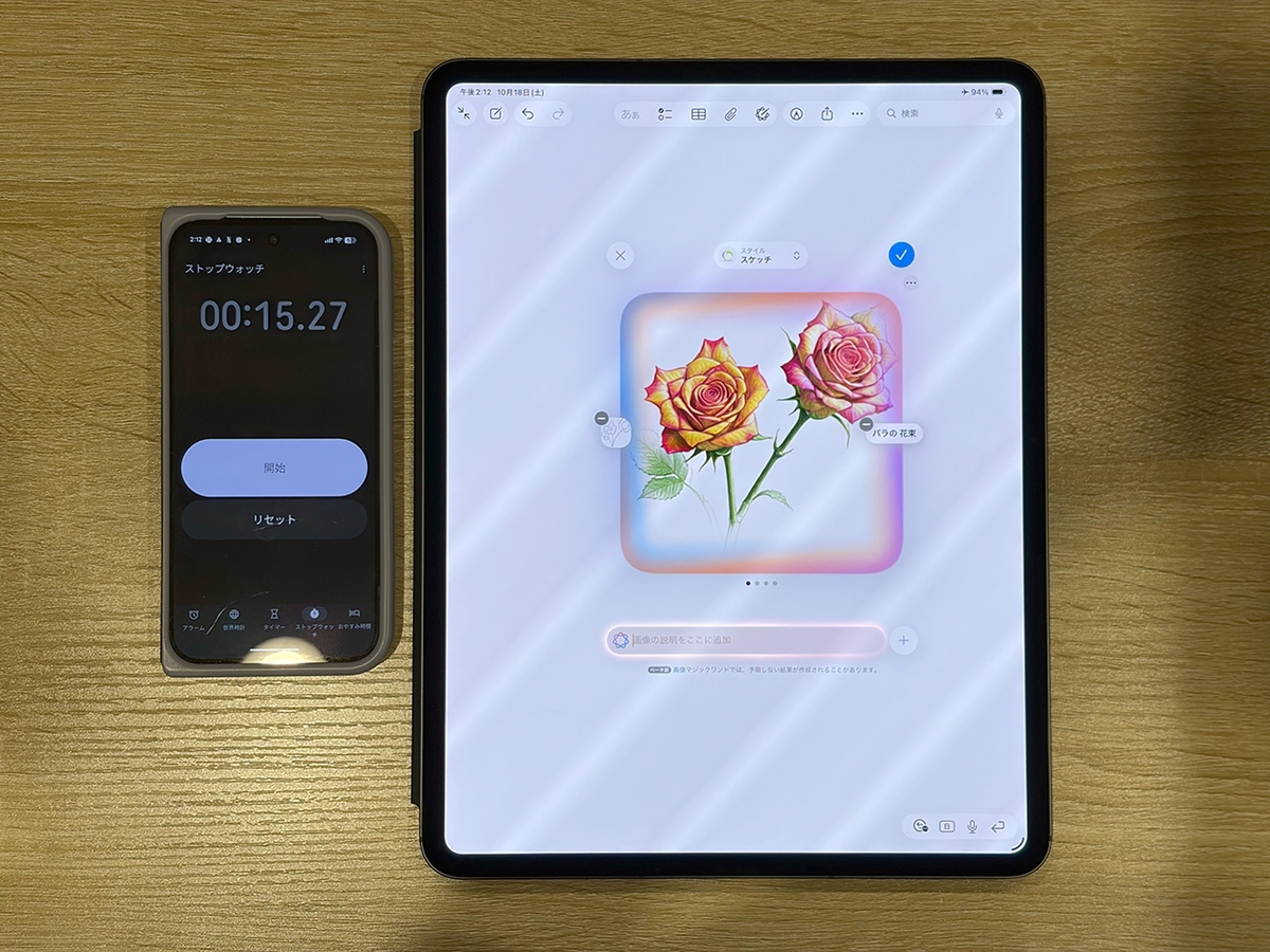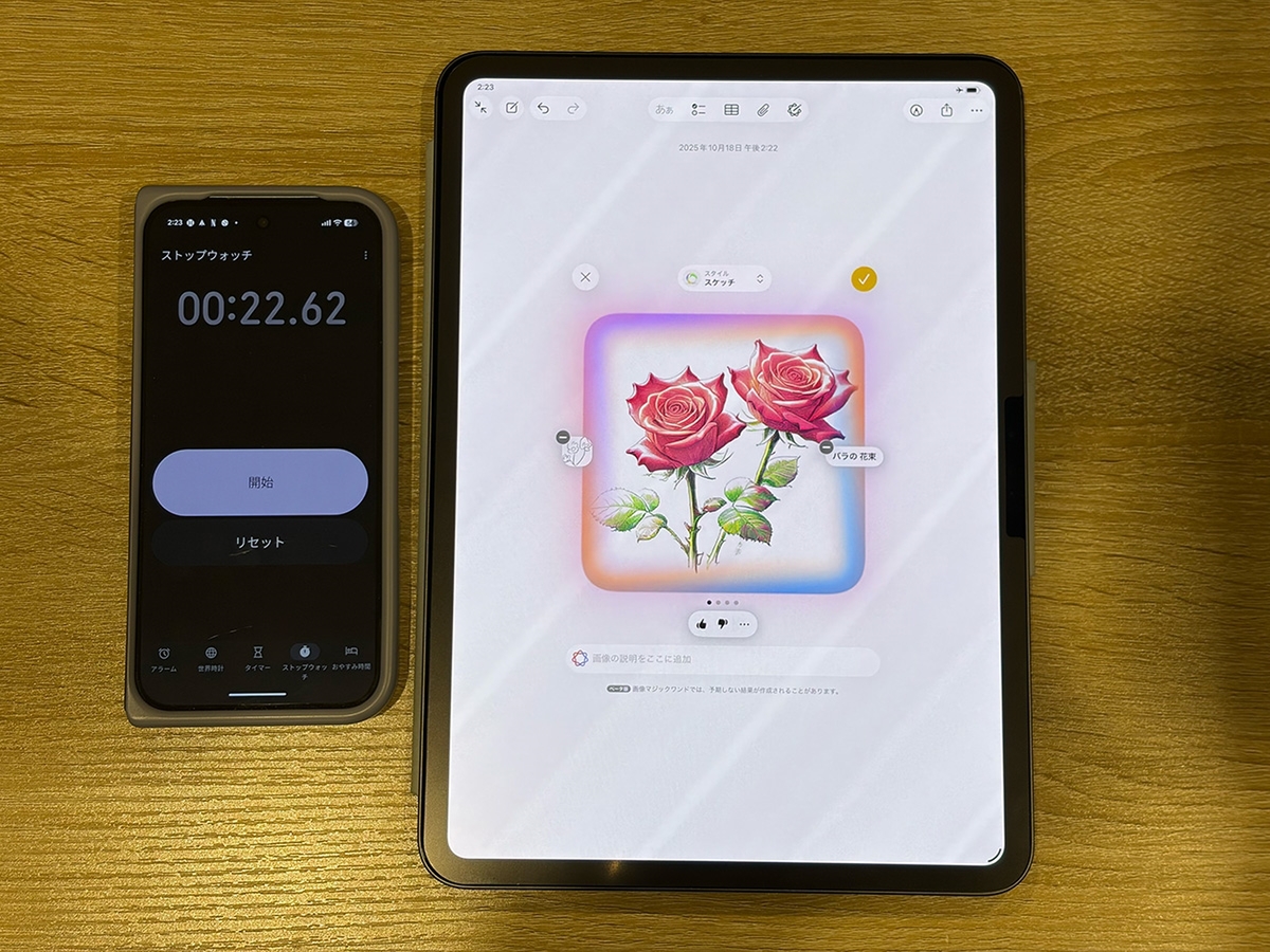 Apple M5チップのパフォーマンスについてはベンチマーク計測の比較結果を紹介したかったところですが、先行レビュー期間にベンチマークソフトを使った計測は不可ということでした。そこで、Apple IntelligenceのImage Playgroundや、メモアプリで描いた大まかなスケッチから、iPadOSの画像マジックワンドを使ってイラストを生成する速度をストップウォッチで計測しました。11インチのM4搭載のiPad Proと比べています。