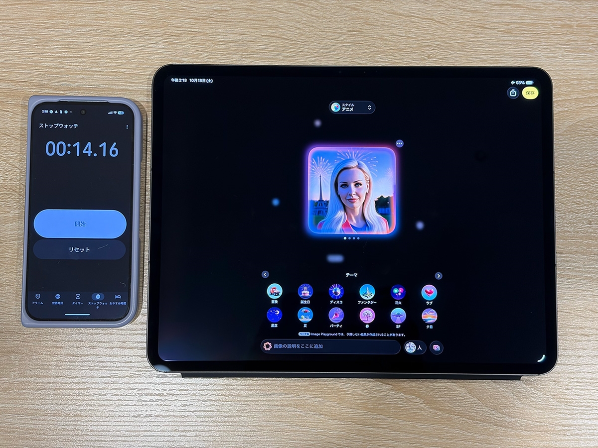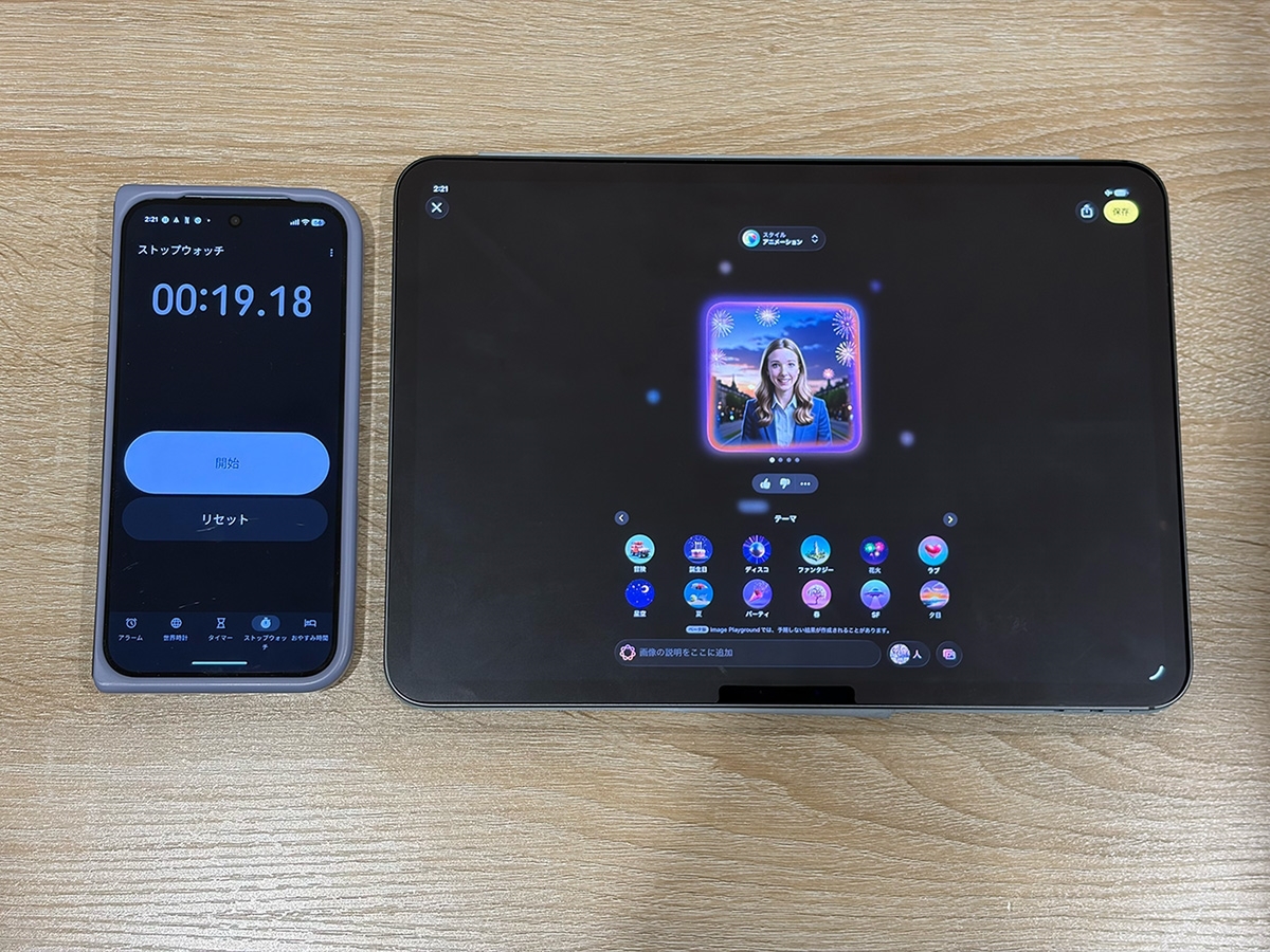 Image Playgroundでは同じキーワードと「テーマ」を設定して、2つのiPad Proで4パターンの画像候補を生成するまでの時間を測りました。M5搭載機は約14秒、M4搭載機は約19秒かかっています。