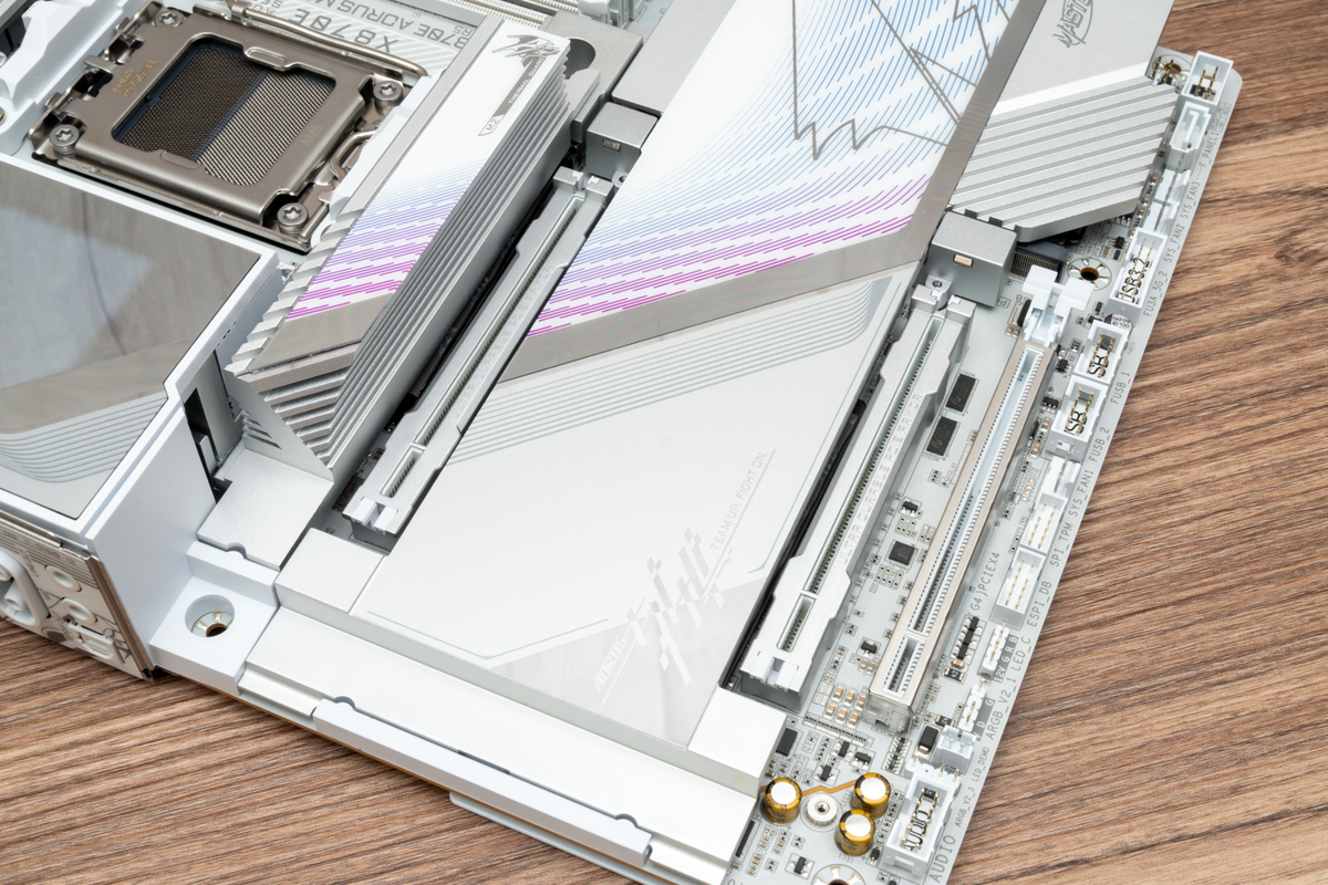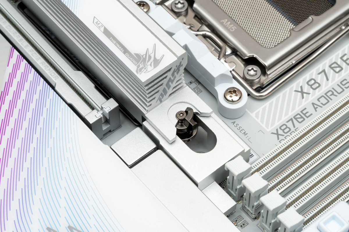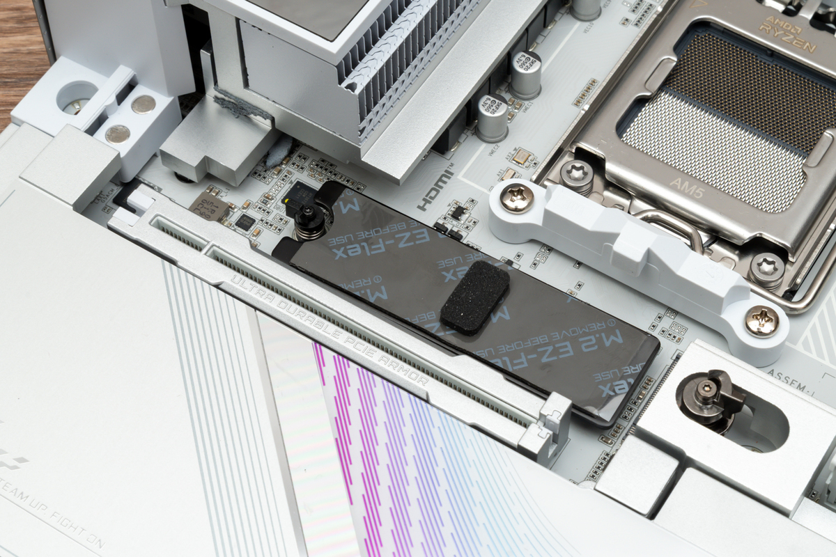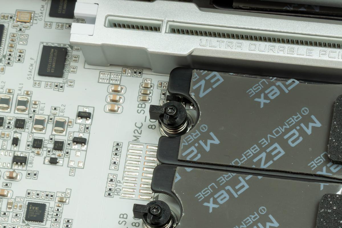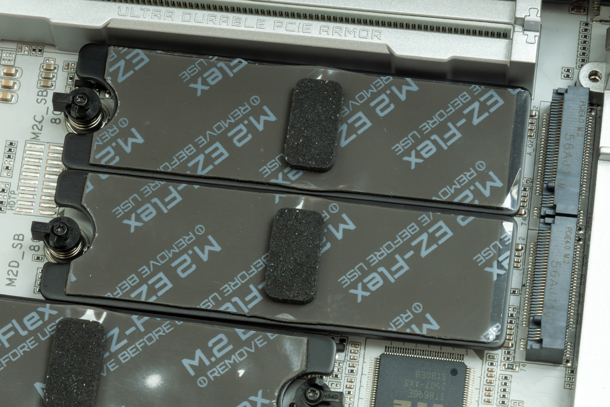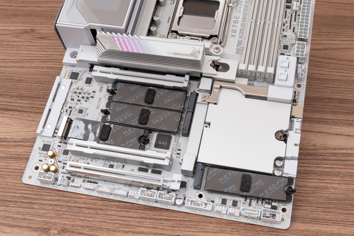 ストレージ向けのM.2拡張スロットは計5基を備え、いずれのスロットにもツールレスでM.2ヒートシンクとM.2 SSDを着脱できる「M.2 EZ-Match」、「M.2 EZ-Latch Plus」が備わっている。そのうえ、M.2 SSDの裏面から冷却を手助けする新型の「M.2 EZ-Flex」が採用されているのもポイント。高発熱なPCIe5.0×4インターフェース採用の最新M.2 SSDとの組み合わせでも、冷却不足に陥らない。
