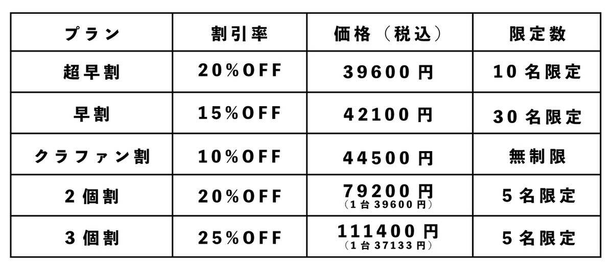 - クラファン特別価格:39,600円(税込・送料込)〜