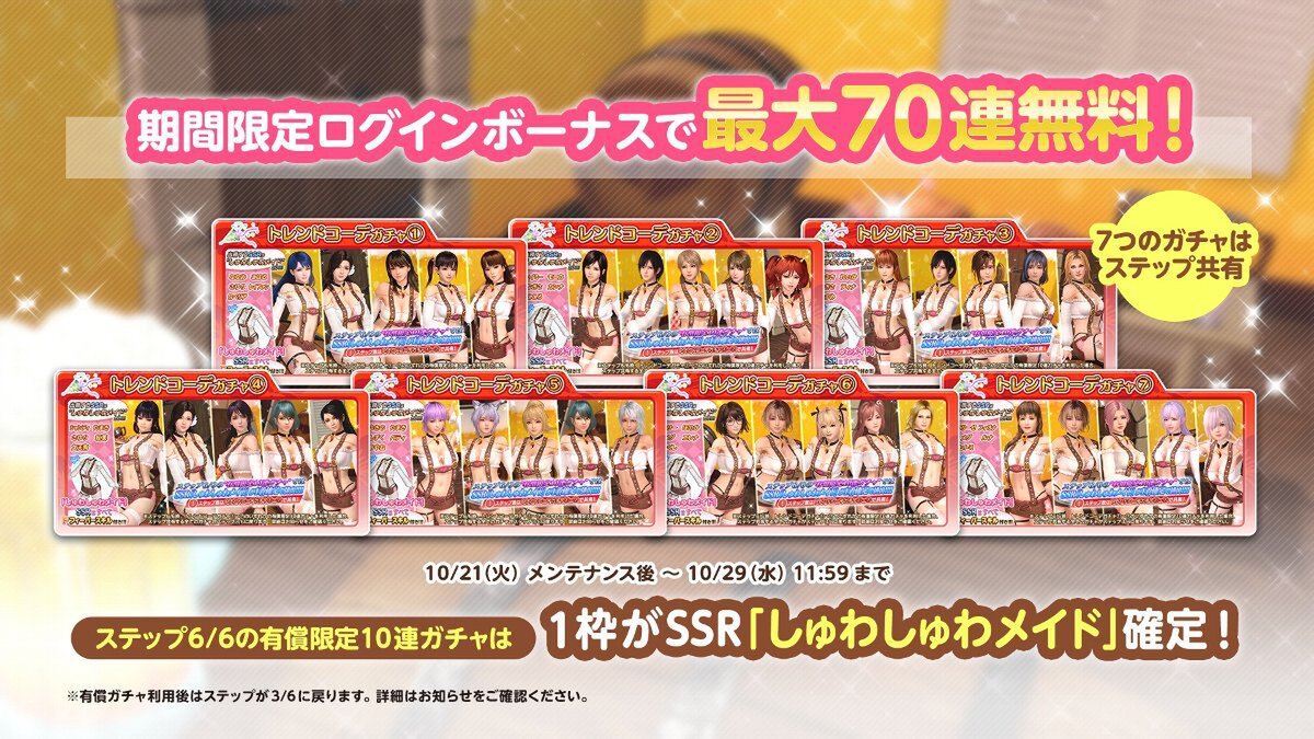 国際版DOAXVVで登場したSSR水着「しゅわしゅわメイド」が、新たに7名の女の子を追加してトレンドコーデガチャで登場。期間中、トレンドコーデガチャ専用の10連ガチャチケットが毎日もらえるログインボーナスを開催する(最大7日間)。