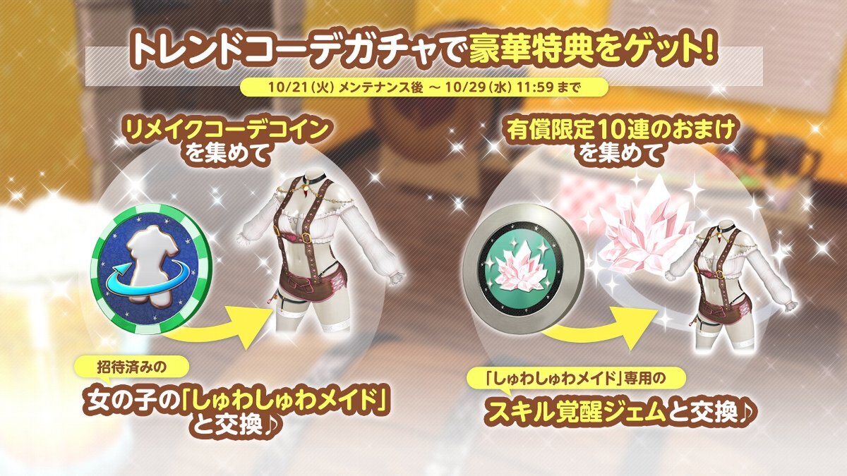 期間中、SSR水着「しゅわしゅわメイド」1着を下取りに出すと、「リメイクコーデコイン」を25枚入手できる。「リメイクコーデコイン」200枚(8着分)と交換で、招待済みの女の子のSSR水着「しゅわしゅわメイド」1着を入手できる。