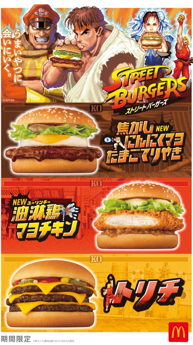 ゲームのキャラクターのリュウ、ケン、春麗(チュン・リー)をテーマにしたバーガーがそれぞれ登場。発売に先駆けて放送開始されたTVCMでは、ゲームの世界観とマクドナルドを強引(!)に掛け合わせた内容も注目されています。