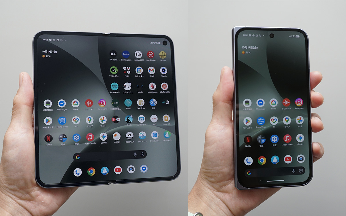 比べると10 Pro Foldの外側6.4型のディスプレーは、アスペクト比が20:9。6.3型のPixel 10 Proと同じ感覚で使えるので心地よいです。YouTubeのコンテンツは外側ディスプレーで気軽に見て、アニメやドラマはNetflixやAmazonプライムビデオを起動して、内側ディスプレーでのめり込むという使い分けを楽しみました。
