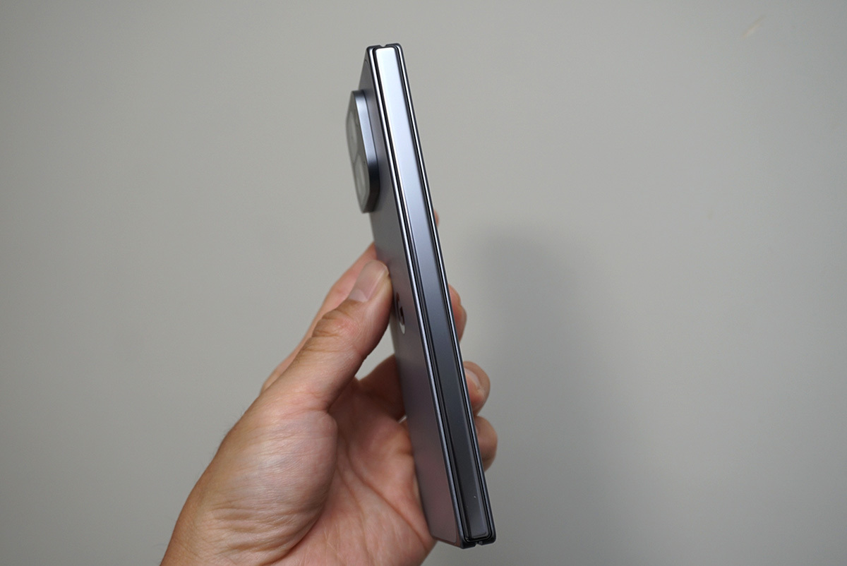 10 Pro Foldが採用するギアレスヒンジは開閉動作がとてもスムーズです。閉じた状態でふたつの筐体がほぼピタリと重なり合い、金属ヒンジの背中が美しく映えます。海外のYouTuberが実施した、本機の耐久性テストの結果が話題となっているようですが、常識的な範囲で使う分には本機が壊れやすいフォルダブルスマホだとは思えませんでした。