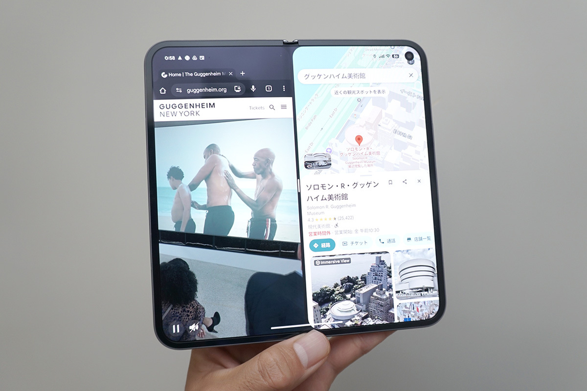 内側8型のディスプレーは、ちょうど6型台のスマホを2台横に並べたようなサイズ感です。2つのアプリを同時に起動しながら、グーグル純正のフォトとGmailのように、ファイルのドラッグ&ドロップに対応するアプリもあります。ウェブ検索をしながらメッセージを入力したり、マルチタスクが心地よくこなせるところは横開きフォルダブルスマホの醍醐味であると実感します。