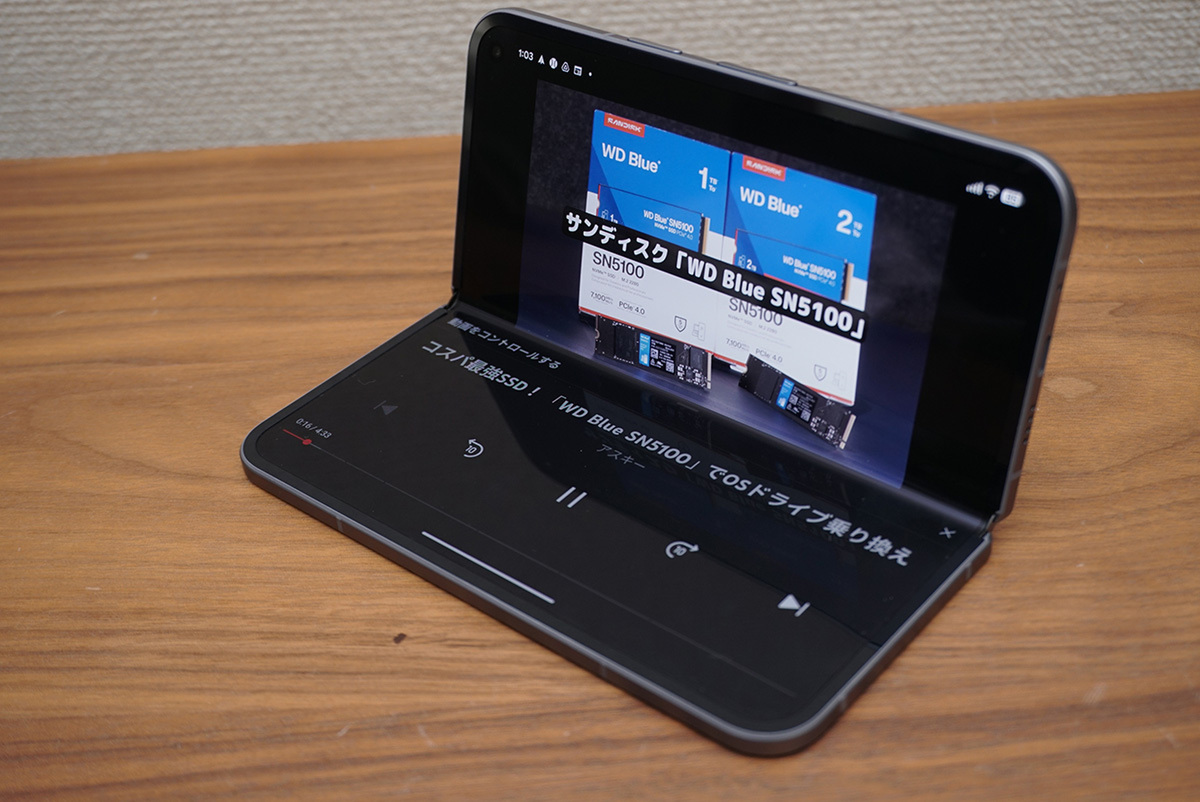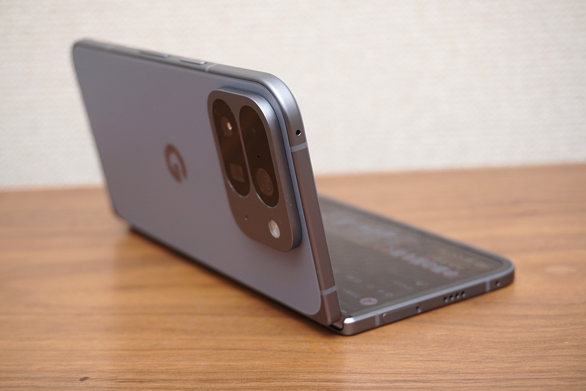 初代のPixel Foldは本体を横向きにして画面を開き、テーブルに置いた状態で動画コンテンツなどを再生するビューワーモードにすると、背面カメラユニットの重さで後に倒れがちでした。新しい10 Pro Foldは比重のバランスが向上して、ビューワーモードがより安定します。