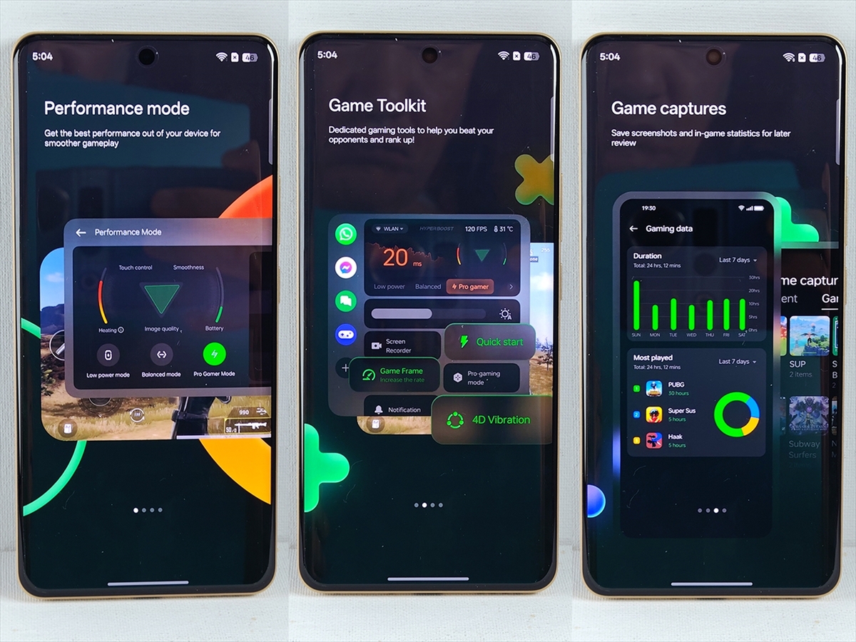 ゲームプレーのための機能も搭載している。Performance Modeはユーザーが「低消費電力」「バランス」「プロゲーマー」から選択し、タッチの反応や画像品質、滑らかさ、発熱・電池消費を自分好みに最適化できる。