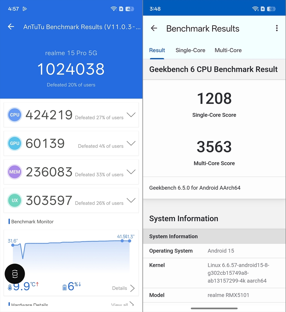 本体のベンチマークは、AnTuTuが102万台、GeekBenchはSingle Core 1208、Multi-Coreで3563だった。Snapdragon 7 Gen 4搭載モデルとしては妥当なところだろう。SNSやカメラなど、一般的なスマートフォンの操作でももたつくことはなく、写真のAI加工などもストレスなくできた。