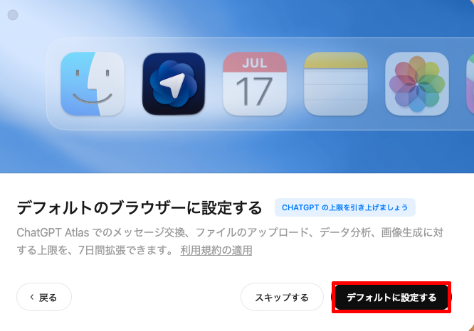 ChatGPT Atlasをデフォルトブラウザーとして使用したい場合は「デフォルトに設定する」をクリック。また、引き続き以前のブラウザーをデフォルトにしておきたい場合は「スキップする」をクリックだ。
