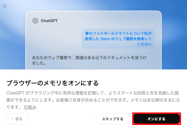 ChatGPT Atlasはユーザーのブラウズ履歴を記録し、それを元にスマートな回答や先を見越した提案ができるようになっている。これを活かすためにメモリー機能を「オンにする」必要がある。なお「スキップする」を選ぶとこの機能は使えないが、履歴が記録されることもない。