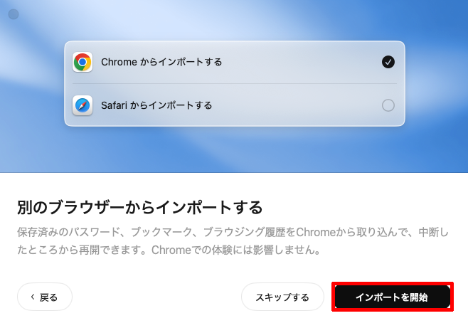 「Chrome」または「Safari」を利用している場合、ブックマークをそのままインポートすることができる。どちらかを選んで「インポートを開始」をクリック。