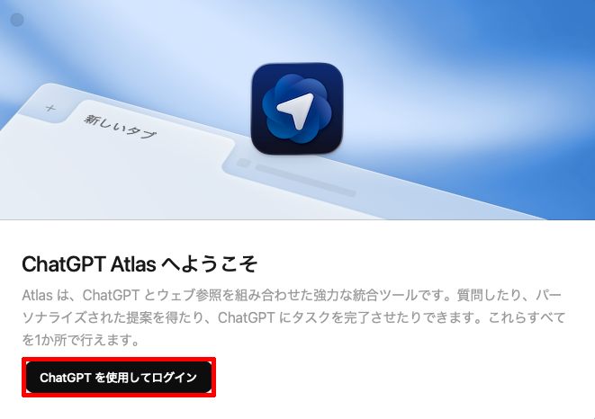 インストラクション画面が表示されるので「ChatGPTを使用してログイン」をクリック。