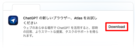 さっそくインストールしてみよう。MacユーザーならChatGPTを開くとこのような画面が表示されるので「Download」をクリックすればよい。表示されていない場合はChatGPT Atlasのページからダウンロードしよう。