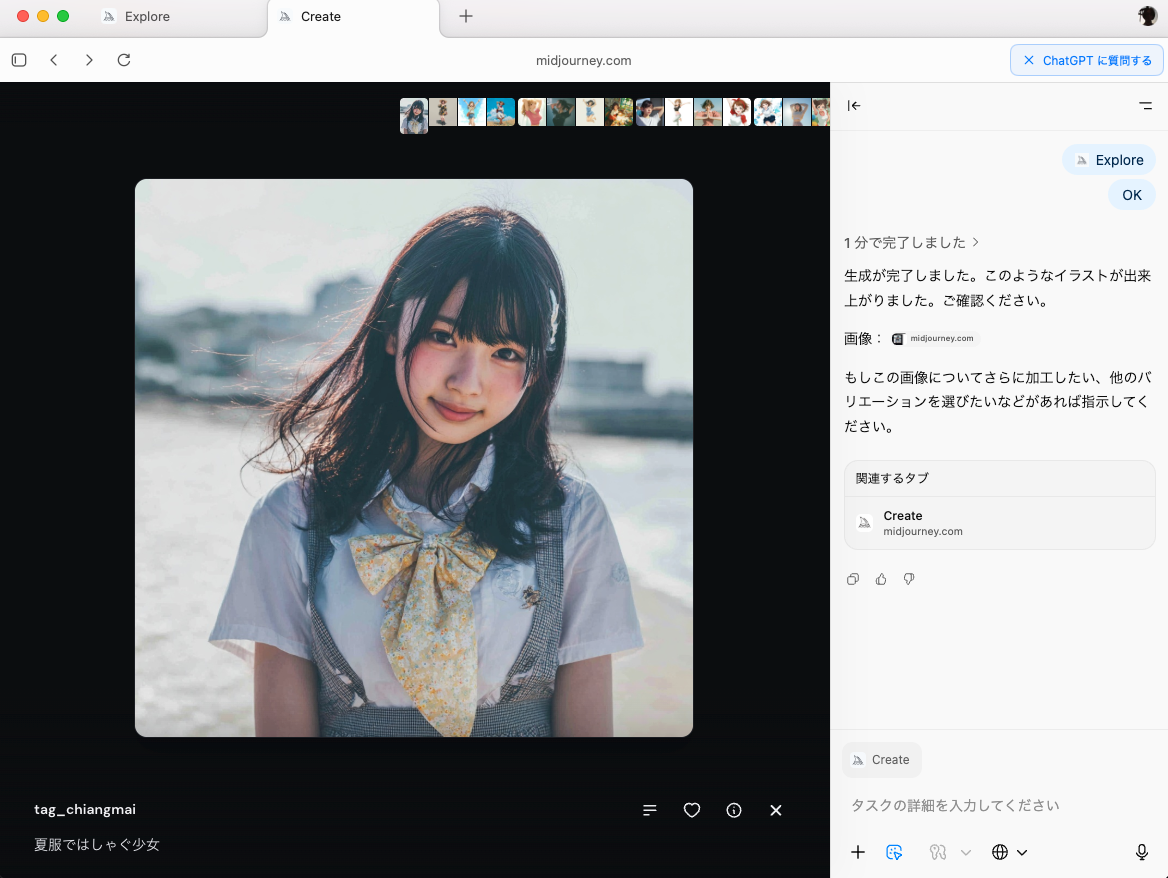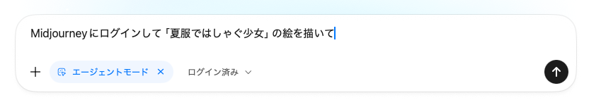 ChatGPT Atlasでは、AIエージェントがあなたの代わりにブラウザ操作を実行できる。たとえば「Midjourneyで「夏服ではしゃぐ少女」を描いて」と指示すれば、エージェントが自動でMidjourneyを開き生成まで進めてくれる。ただし、あらかじめMidjourneyにログインだけはしておく必要がある。 - 応答速度と安定性の向上