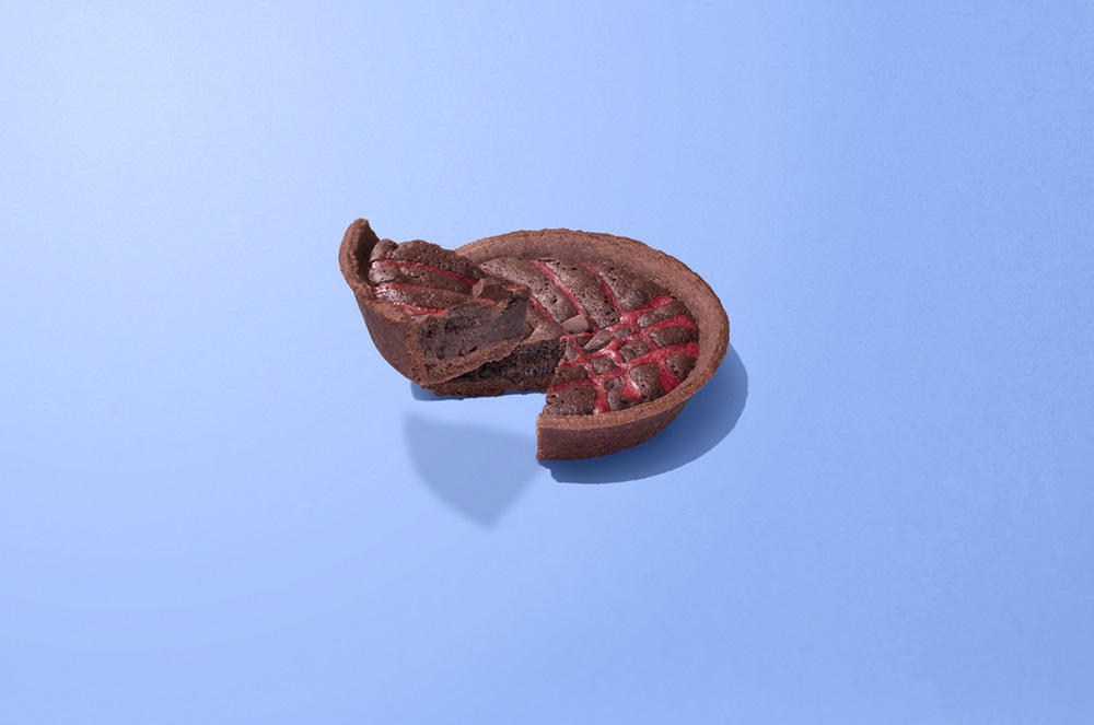 ガトーショコラ生地にチョコホイップとガナッシュを重ね、マーブル模様のドーム型ムースをのせたケーキです。ムースの中にはとろけるチョコソース入りで、濃厚な味わいです。