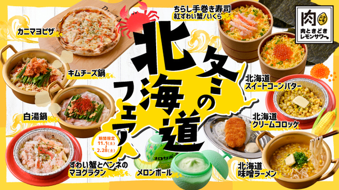 食べ放題&飲み放題専門店「肉ときどきレモンサワー。」は、11月1日から、北海道の冬の味覚を食べ放題で楽しめる「冬の北海道フェア」を全国6店舗で開催します。