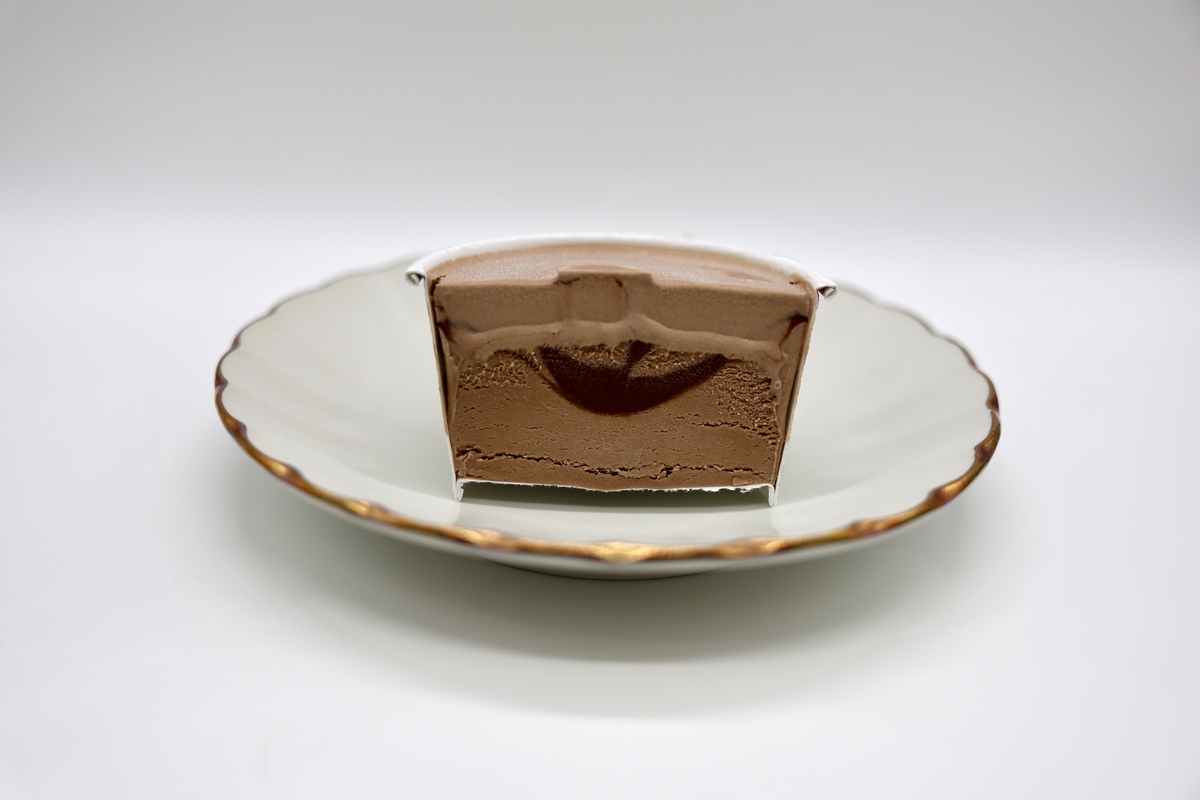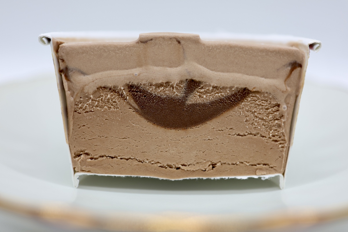 中身は「なめらかな質感が特長の濃密ガナッシュ」が入っているとのこと。切ってみると、確かに層構造のチョコレートアイスクリームとなっています。