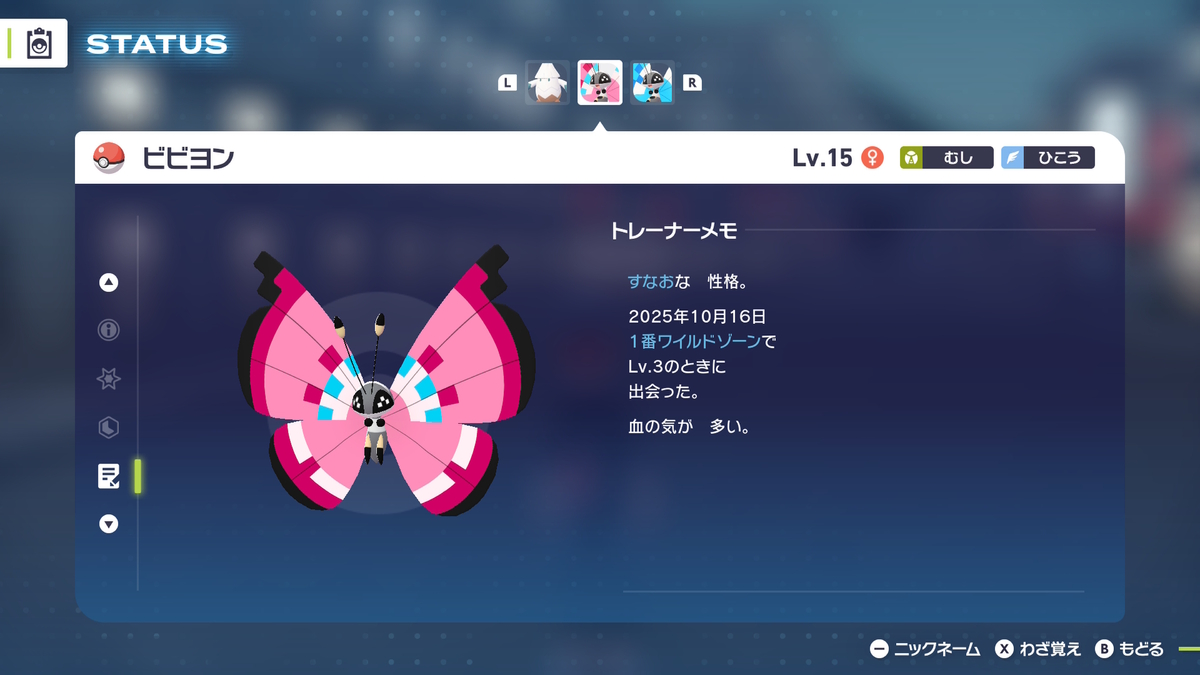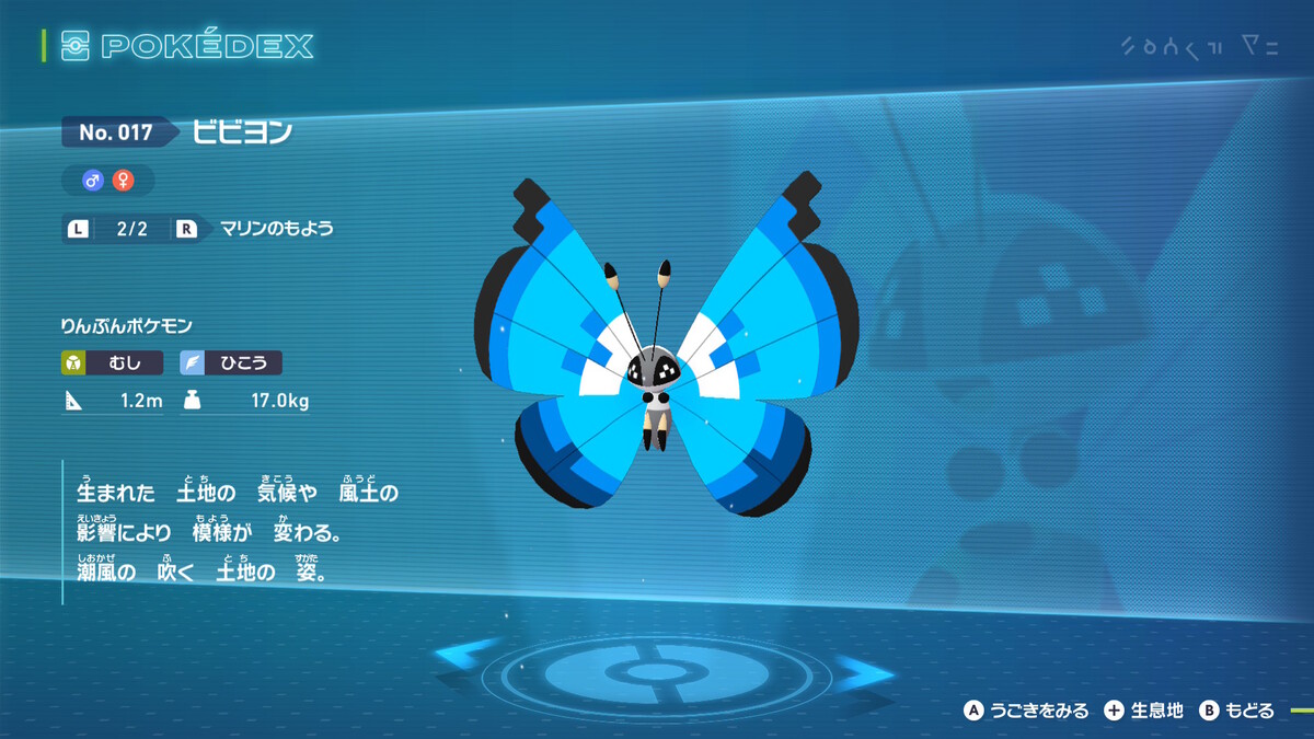どうも過去作で実装された際、海外で捕まえるとこの模様のビビヨンに進化する仕様だったとのこと。ゲーム内でほかに入手する手段はなさそうなので、大事にすることをおススメする。