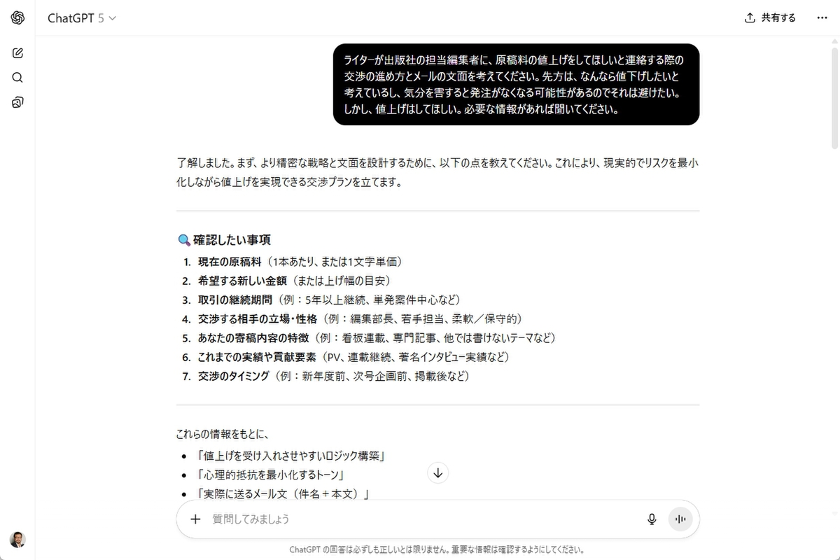 そこで、次は、前提条件を提示し、気分を害さないような文章にするように指示してみる。相手はそもそも原稿料を下げたいと思っているという情報も追加してみた。さらには、情報が足りないなら、質問するようにも指示しておく。この逆質問テクニックは効果的なので、クオリティの高い出力が欲しい時に活用して欲しい。