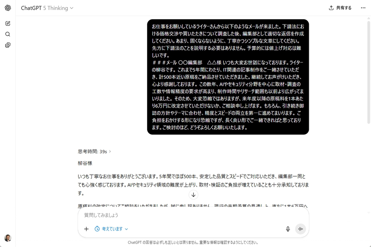 そこで、ChatGPTにまずは下請法について調べさせ、その後、適切な返信を書くように指示してみる。最初、ライターに対して下請法の説明を始めてしまったので、「先方に下請法のことを説明する必要はありません」と一文追加した。