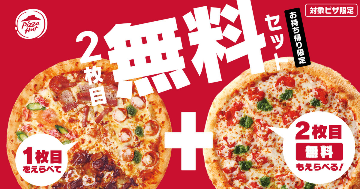 ピザハットでは、1枚目に対象ピザを注文すると、2枚目対象のピザが持ち帰りで無料、配達で通常価格から半額になるキャンペーンを実施中です。冬の新商品もキャンペーン対象となるのでチェックです。