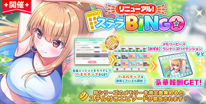 今回のステラBINGOでは、各種ミッションをクリアすることで手に入る「パネルチップ」を使い、3×5のパネルを開放していく。開放したパネルが縦または横に揃うとライン報酬を、すべてのパネルを開放させるとコンプリート報酬を獲得できる。