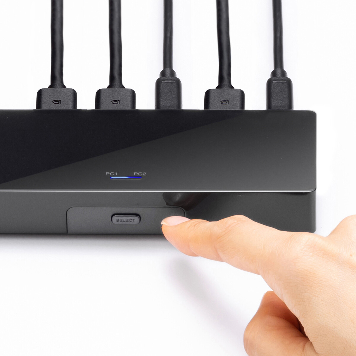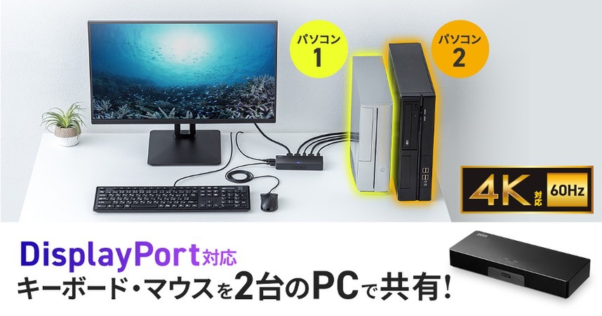 この新モデルは、最大4K/60Hzの高解像度出力に対応しており、ボタンひとつで瞬時にPCを切り替えられる点が特徴だ。映像・操作の両面で快適なマルチPC環境を実現する。