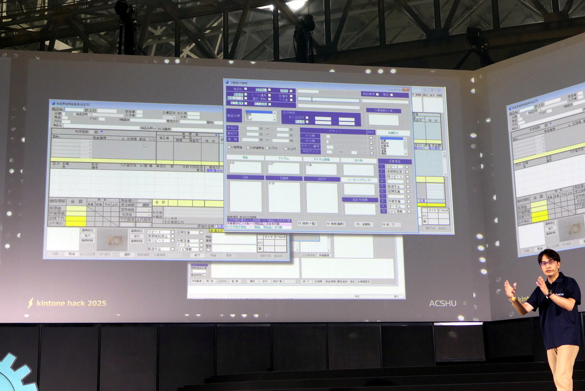 ACSHUは4年前、DXを前提とした大規模なシステムのリプレース案件を担当したという。プラットフォームはすでにkintoneに決まっていたが、リプレース元はWindows系の項目がすさまじい数のシステムだった。「中を開けてみると、なんと30年も運用していた販売管理システム」とのことで、テーブル数は1000、機能数は500、データレコードも圧縮状態で20GBを超えるという。