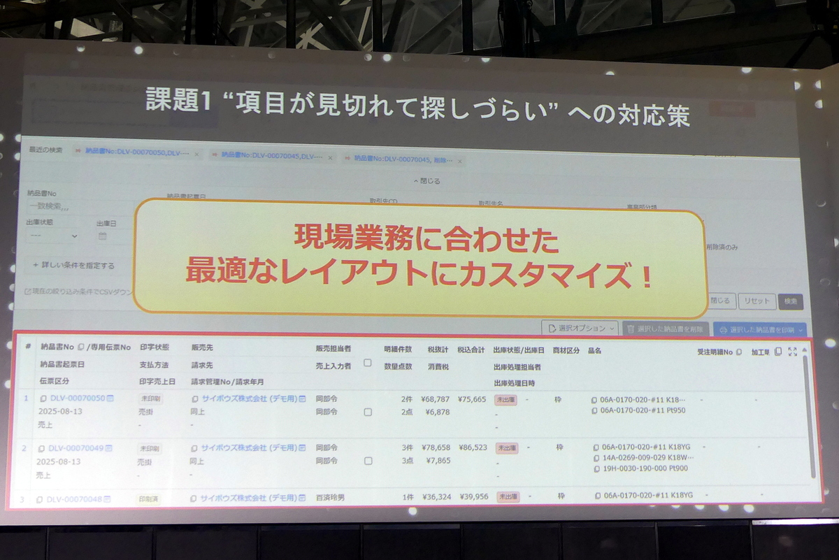 デモでは納品書を2件検索し、一括読み込み機能で表示する様子が披露された。紙の納品書に記載されたバーコードを読み込むと、2件が検索可能。チェックボックスを複数選択し、まとめて納品書を作成することもできる。さらに販売先のリンクをクリックするとマスターが表示されたり、Amazon QuickSightを用いた販売分析も可能になっている。