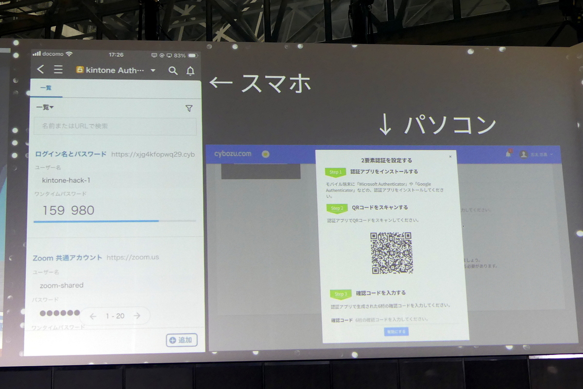 「Authenticatorなんてkintoneでやってどうするんですか?」と志太さん。しかし、社用スマホなくても使えるし、部内での共有も簡単になり、特権アカウントも安全に共有できる。「あれ?便利じゃん」ということで、志太さんはkintone Authenticatorを作ってしまった。認証アプリをインストールし、QRコードをスキャンし、認証アプリで生成された6桁の確認コードを入力すればログインは完了。
